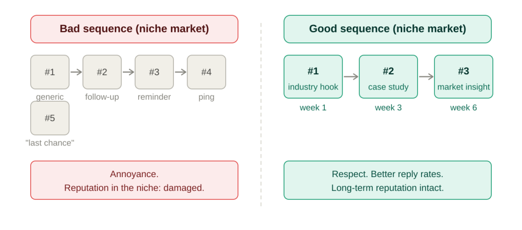 Fewer than you might in a broader campaign. In tight verticals, over-sequencing can damage your reputation in a market where buyers are closely connected. Three well-spaced, value-adding follow-ups are typically more effective than five or more generic nudges.